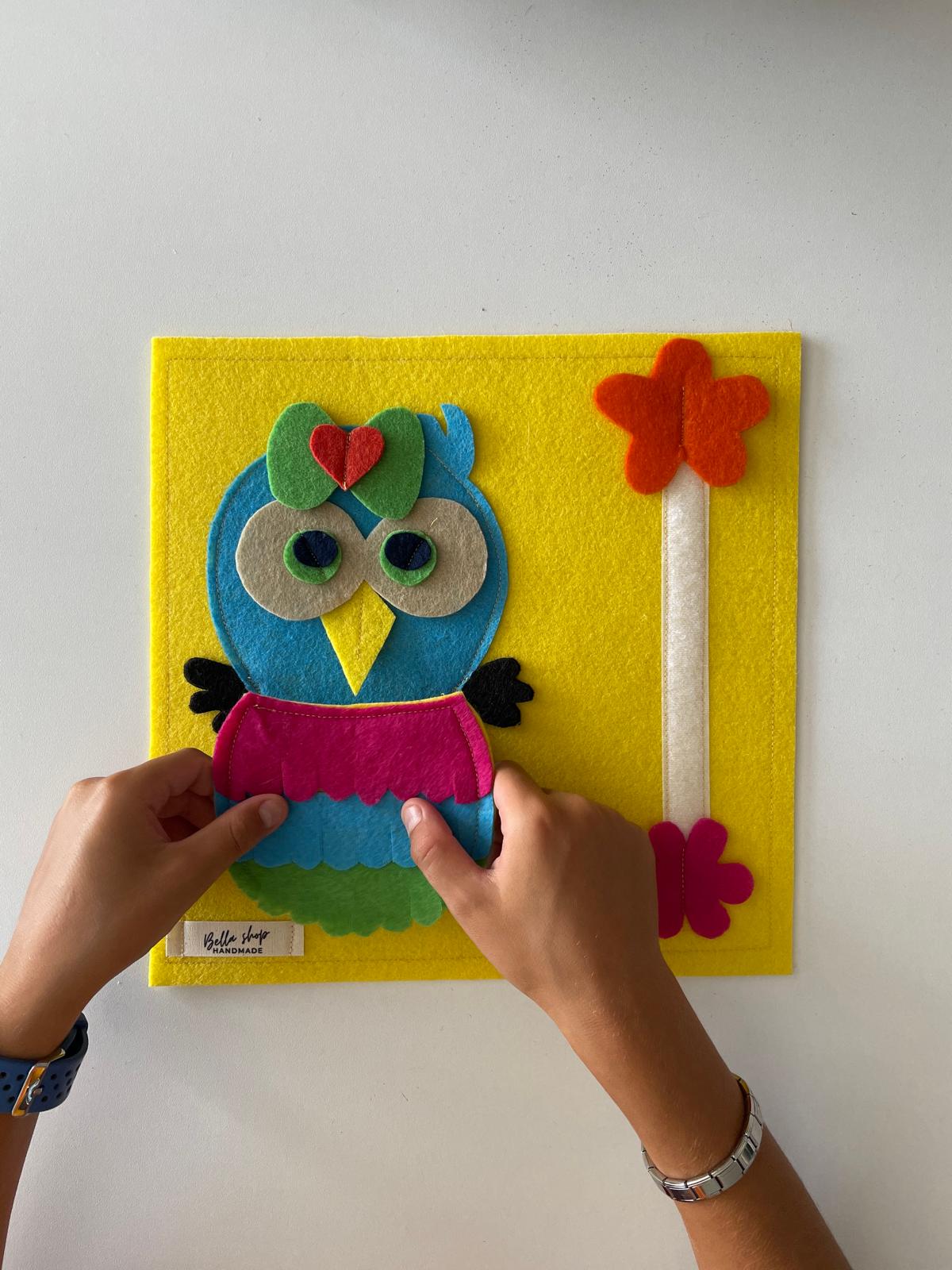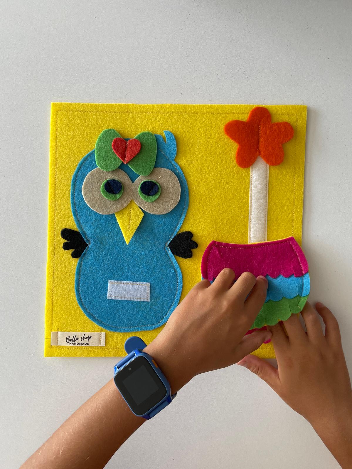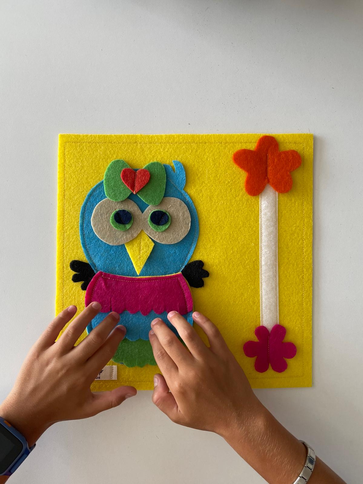 Çocukların renkleri, şekilleri ve hayvanları eğlenerek öğrenmesini sağlayan bu sevimli keçe oyun paneli; dikkat, odaklanma ve el-göz koordinasyonunu geliştirmek üzere özenle tasarlandı.
