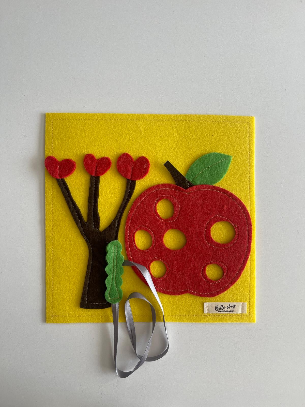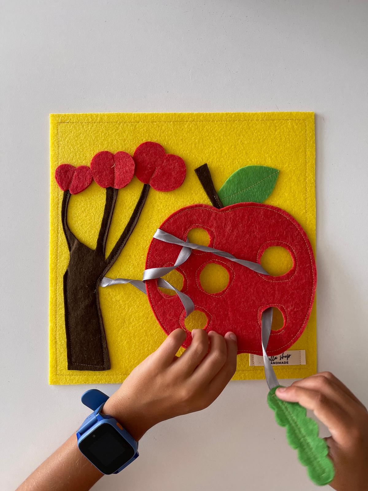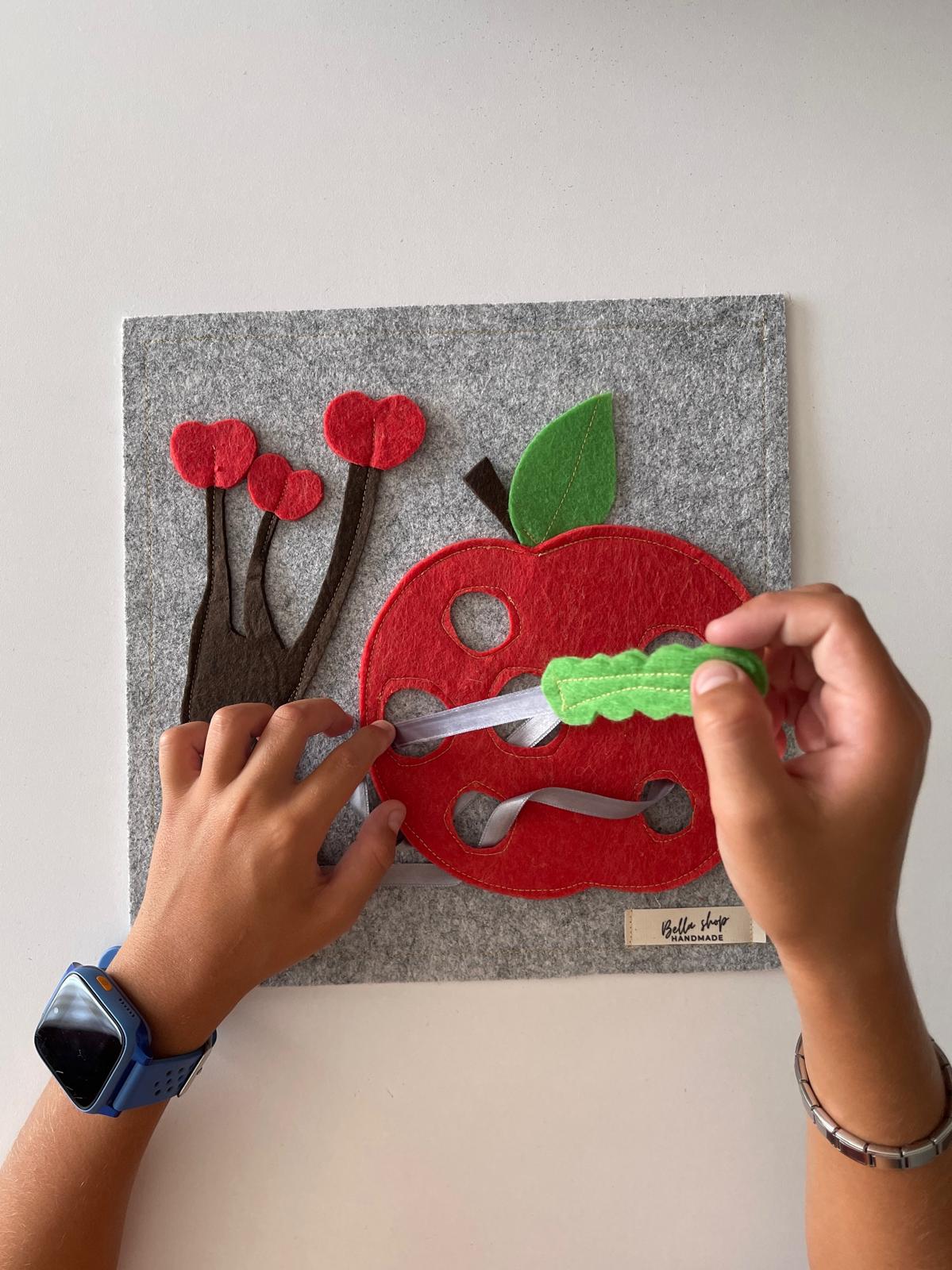 Keçe Elma ve Tırtıl Temalı Motor Geliştirme Oyuncağı, Minik parmaklar için harika bir motor beceri egzersizidir!.