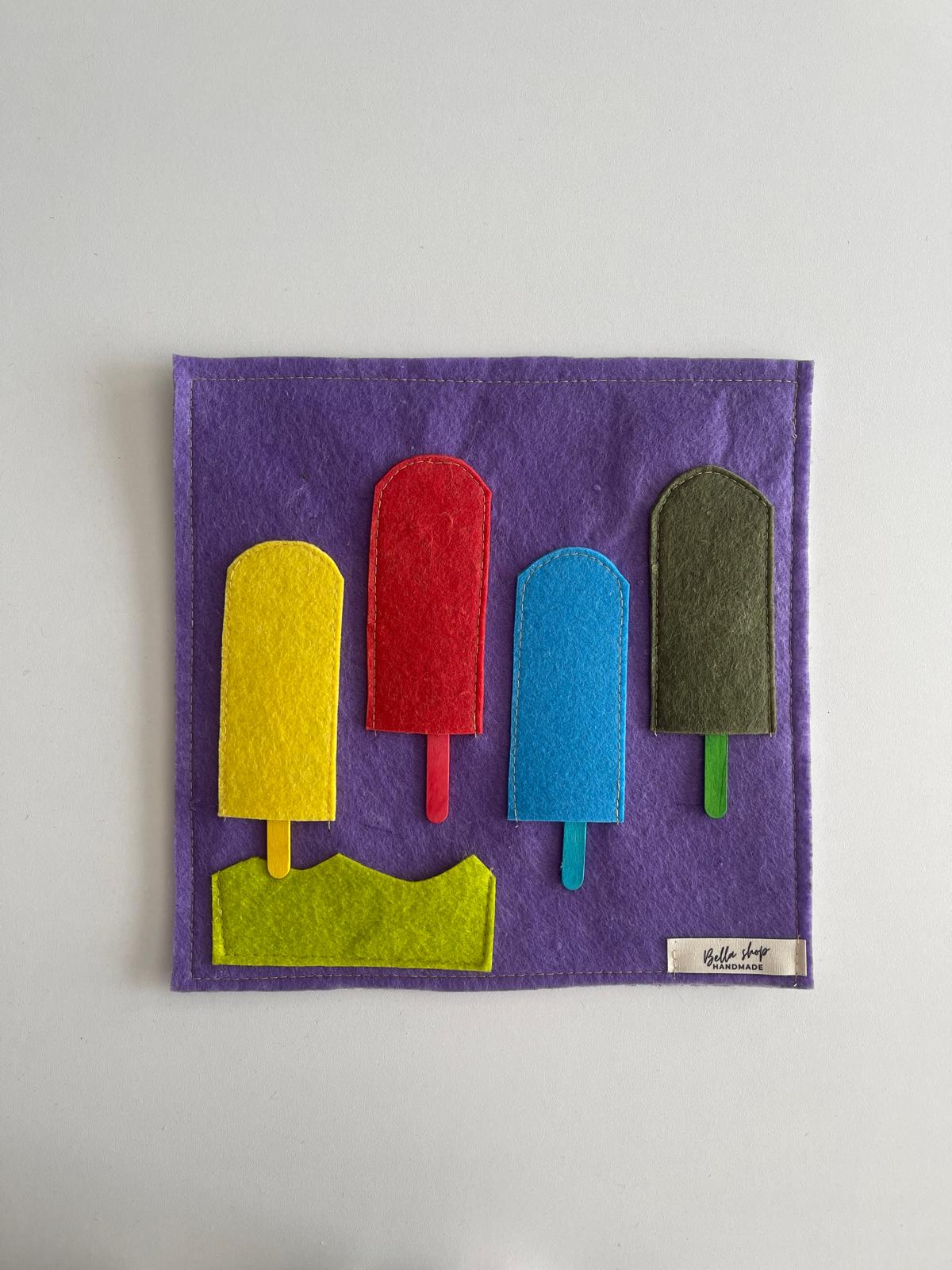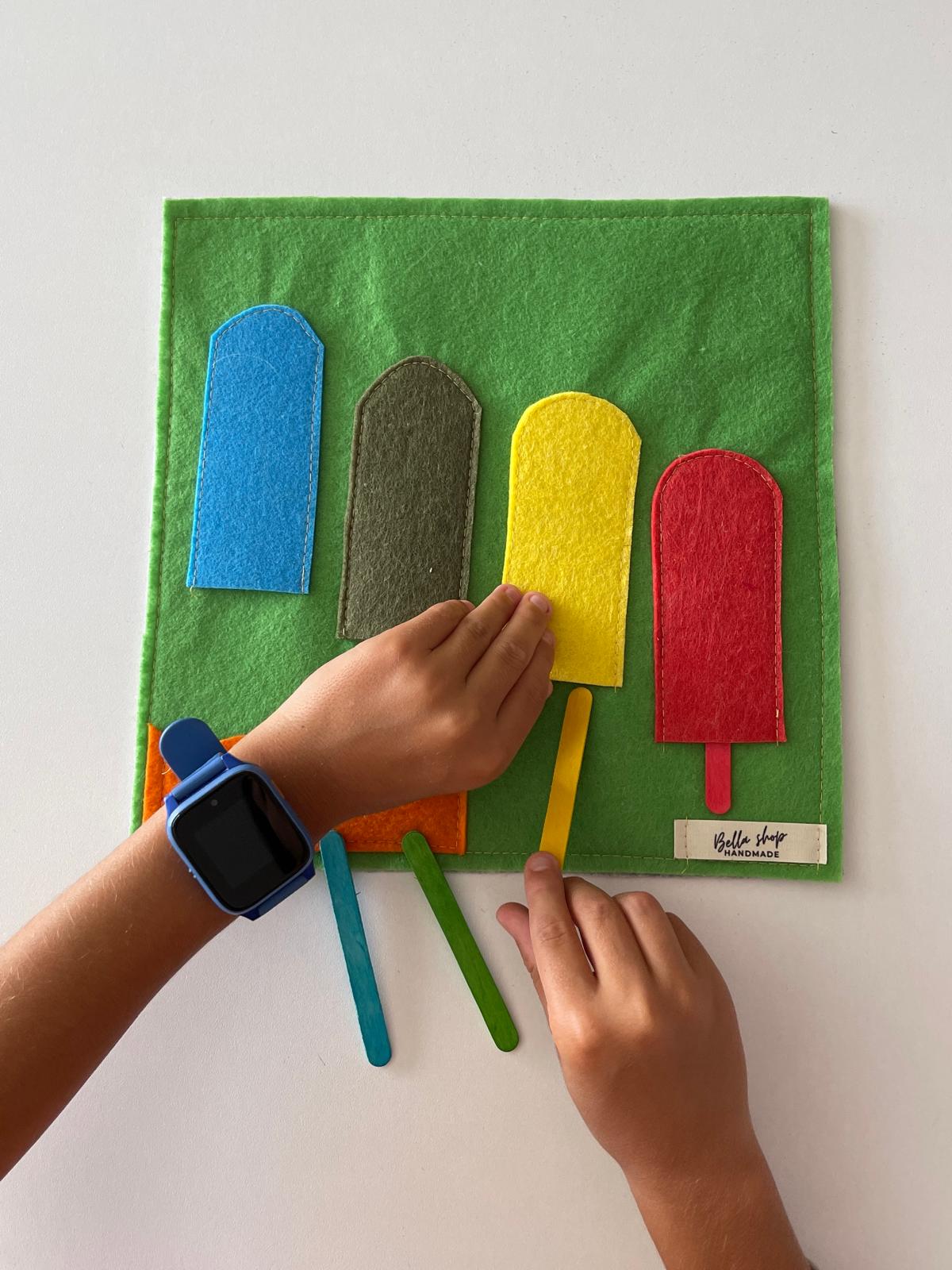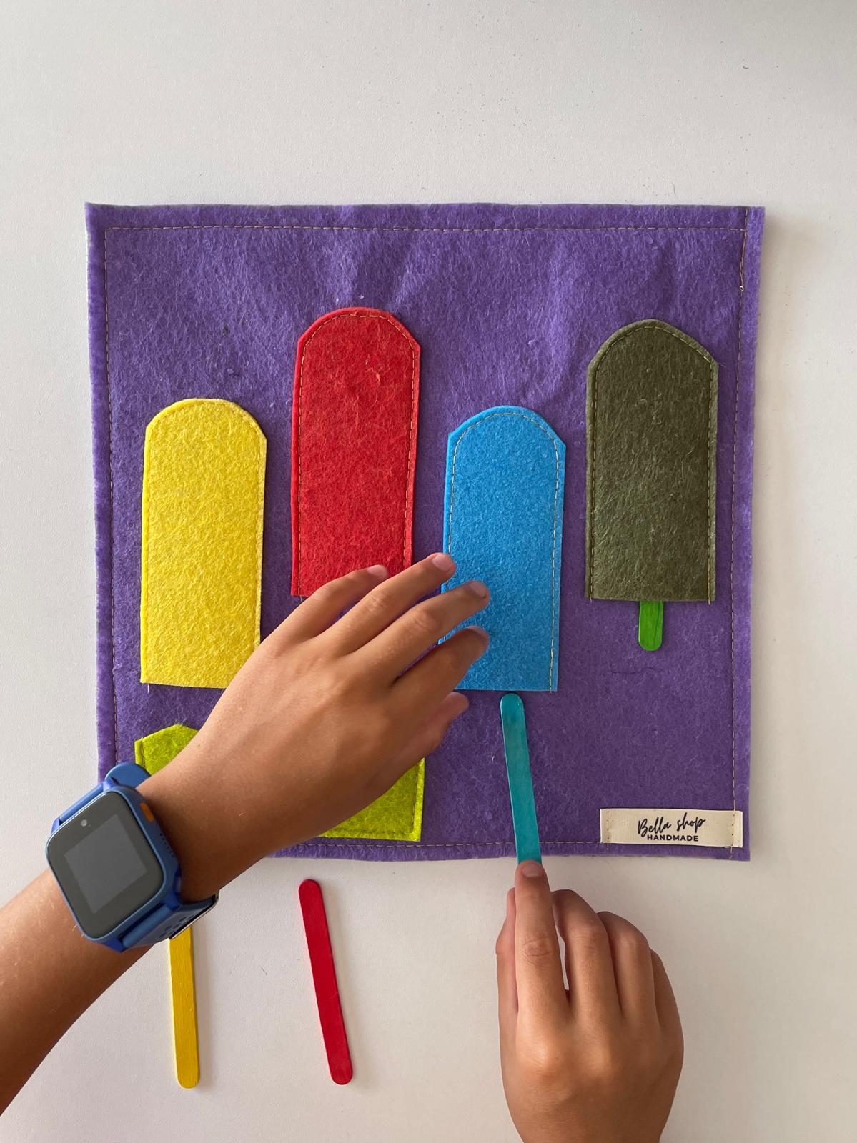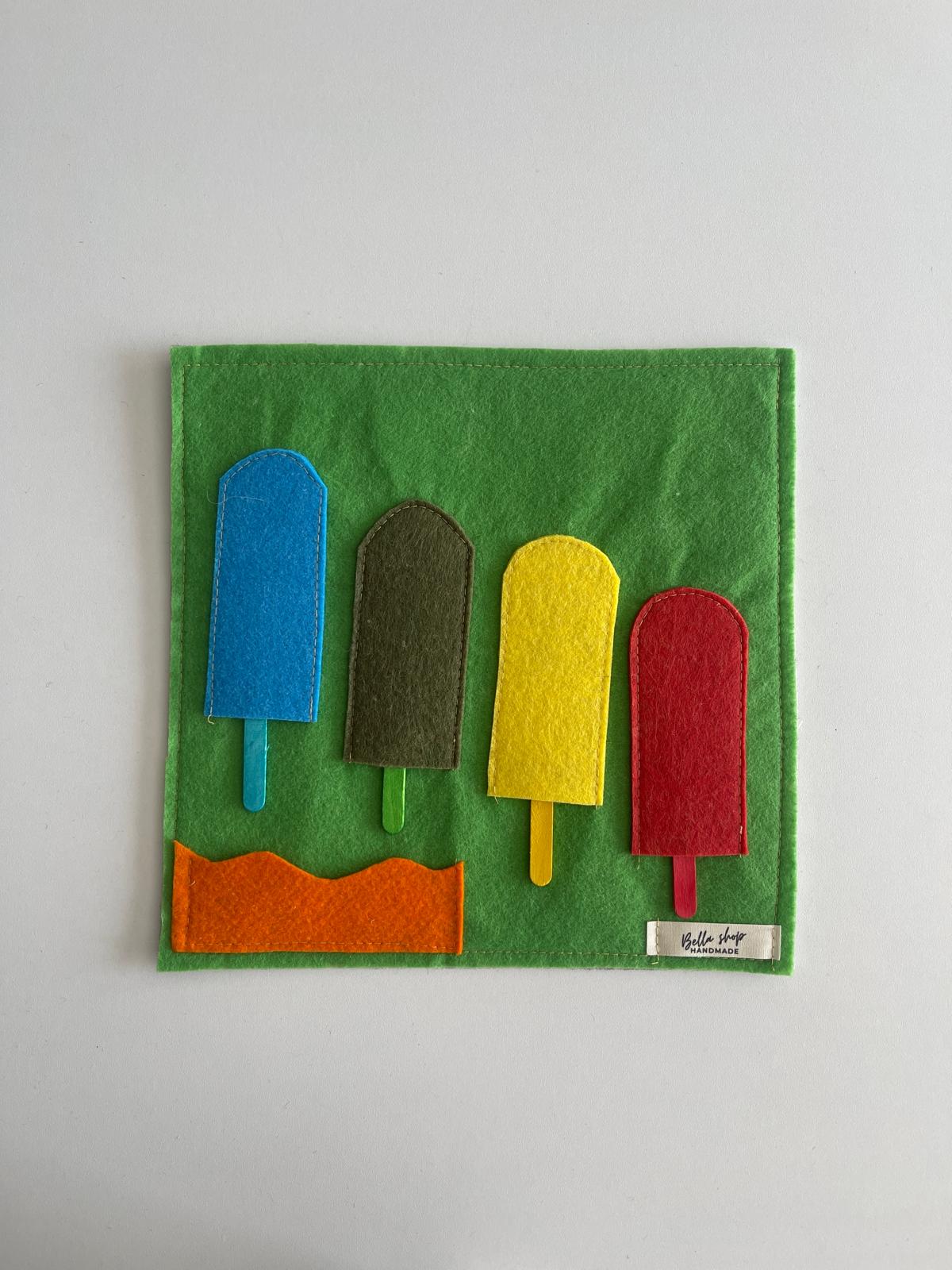 Bu özel tasarlanmış keçe oyun setiyle çocuklar hem renkleri tanıyor hem de el-göz koordinasyonlarını geliştiriyor. Üst kısımdaki renkli dondurmaya karşılık gelen renk şeritlerini eşleştirmeye çalışan minikler, eğlenerek öğrenmenin keyfini çıkarıyor.