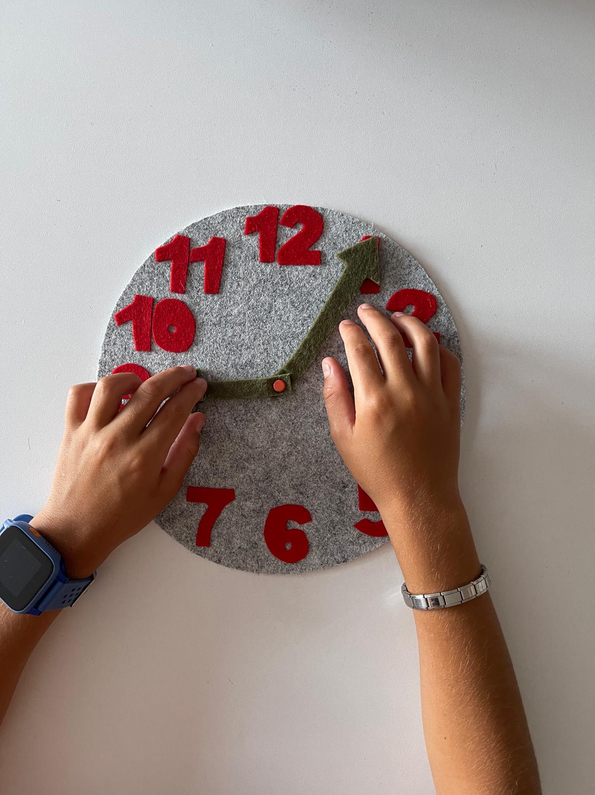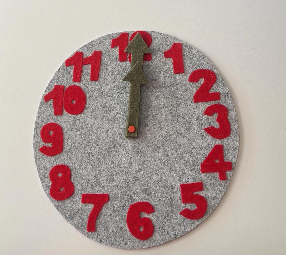 Yumuşak keçe malzemeden özenle hazırlanmış bu renkli saat oyuncağı, çocukların saat kavramını kolayca öğrenmesine yardımcı olur.