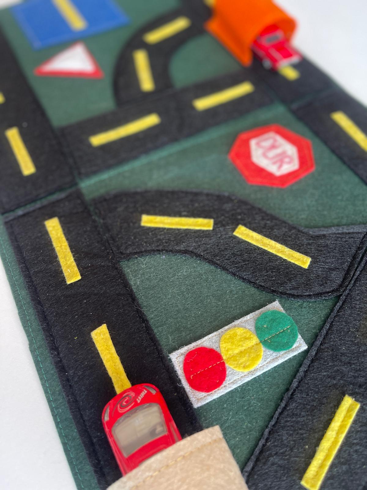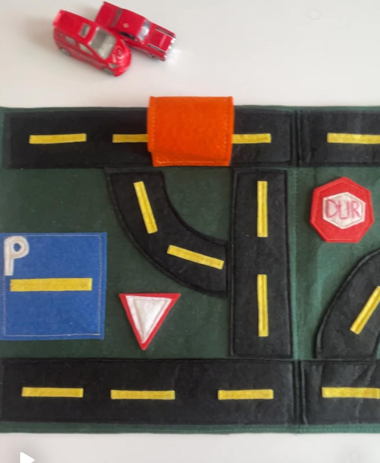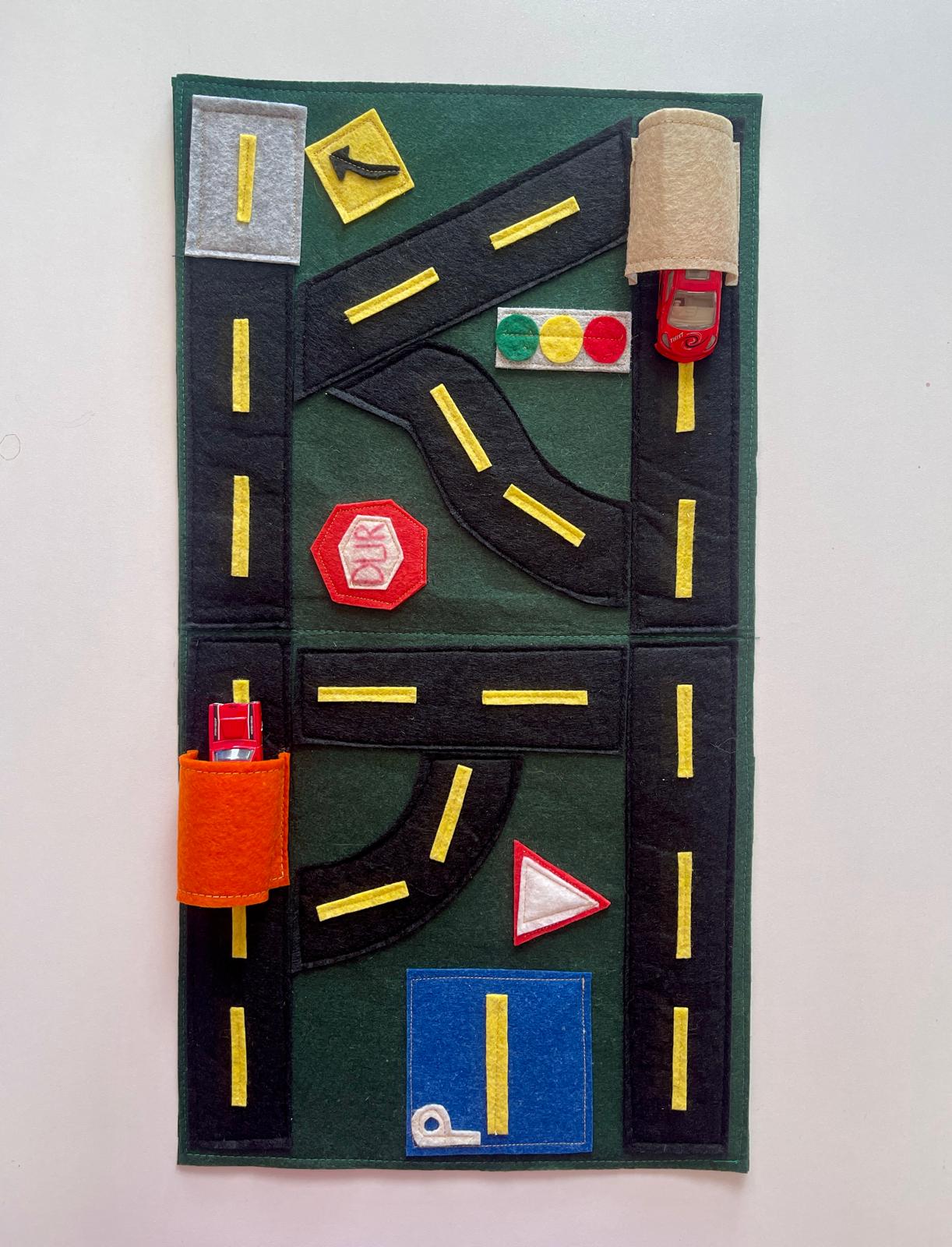 Trafik ışıkları, yol işaretleri, tünel, otopark ve dur tabelası… Hepsi bu eğitici keçe yol setinde bir araya geldi!